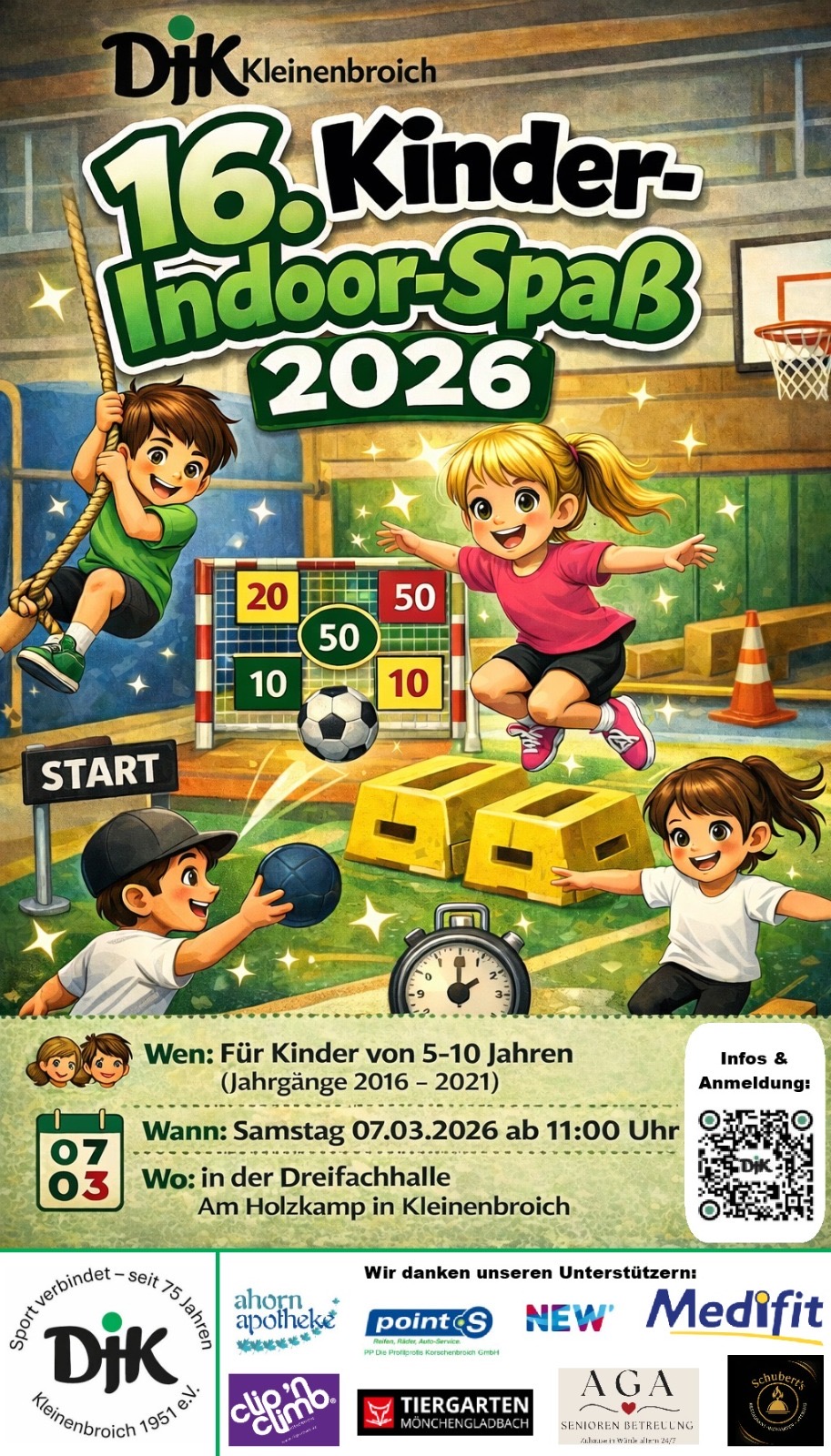 Kinder Indoor Spaß 2026 PlakatDer Kinder-Indoor-Spaß findet am Samstag den 07.03.2026 ab 11 Uhr statt!, wie üblich in der Dreifachhalle Am Holzkamp (von-Stauffenberg-Str. 45).